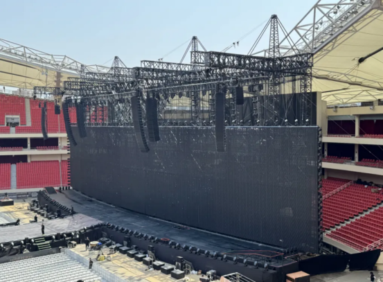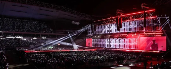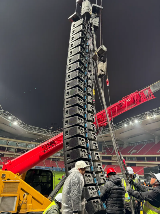 在虹口足球场这样的大型场馆举办演唱会时,扩声设计的首要任务是确保声音覆盖问题得到有效解决,从而打造出声场均匀扩散的效果。这样,无论观众坐在场内的哪个位置,都能享受到清晰、震撼且不失舒适度的声音体验。为实现这一目标,舞台主扩声系统选用了专为大型场面设计的大型三分频线阵列扬声器系统,它们被精心吊挂在舞台两侧,确保声音能够均匀覆盖整个场馆。